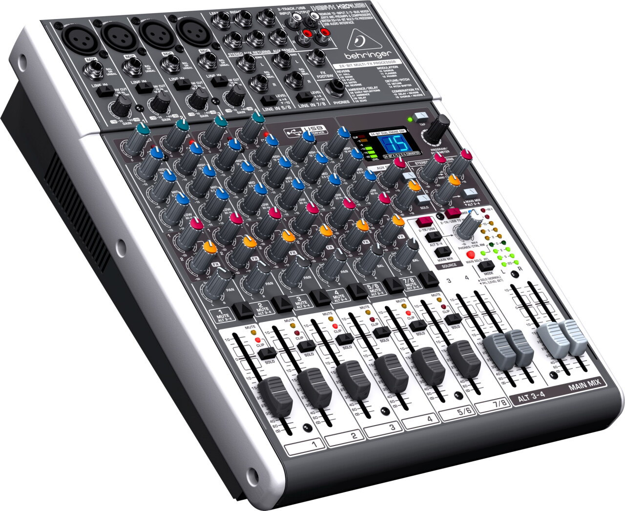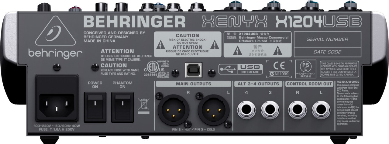 XENYX X1204USB имеет 8 основных канальных входов: 4 монофонических и 2 пары стереофонических. Кроме этого предусмотрено 2 стереоканала для ALT 3-4 шины. 4 микрофонных входа совместимы с динамическими и конденсаторными микрофонами, поскольку микшер имеет функцию отключаемого фантомного питания. Во избежание появления паразитарных шумов микрофонная секция оснащена фильтрами низких частот, а для предварительной нормализации звука вокала или инструмента имеются фирменные предусилители Behringer.