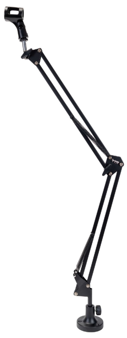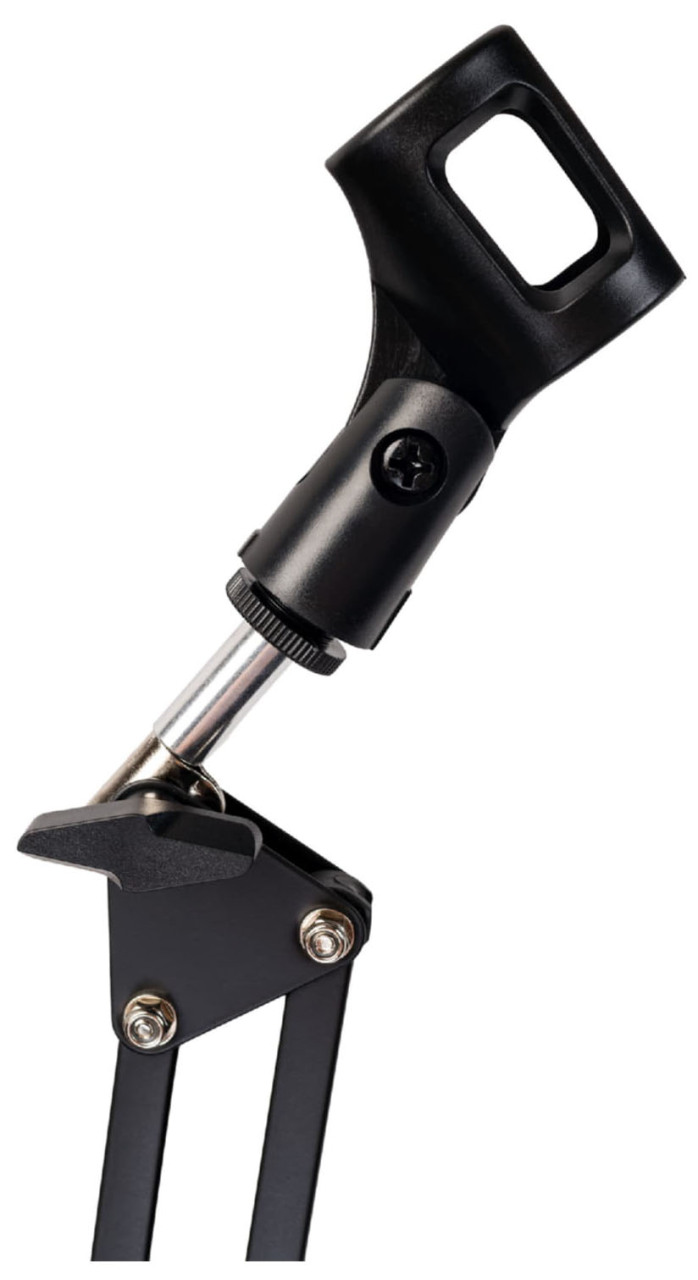 Также в комплекте есть держатель, подходящий для большинства типов проводных динамических микрофонов. При необходимости на стойке можно разместить любой другой держатель (например, держатель паук), так как стойка имеет стандартную резьбу. Помимо этого стойку очень легко отрегулировать под рабочее место, так как она обладает двумя плечами по 36 см каждый.