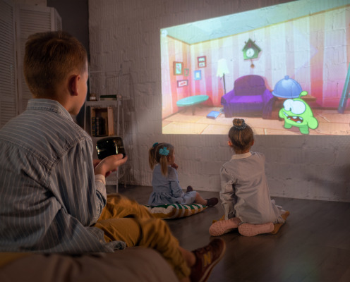 Cinemood Storyteller VR — это портативный кинотеатр для всей семьи, который всегда под рукой. Ваши любимые фильмы и мультики теперь всегда с вами: в самолёте, машине, на даче, в другой стране. Изображение проецируется на любую поверхность, поэтому вы можете устраивать просмотр, где только вам удобно. При этом диагональ экрана варьируется по размеру от 10 см до 3 м.